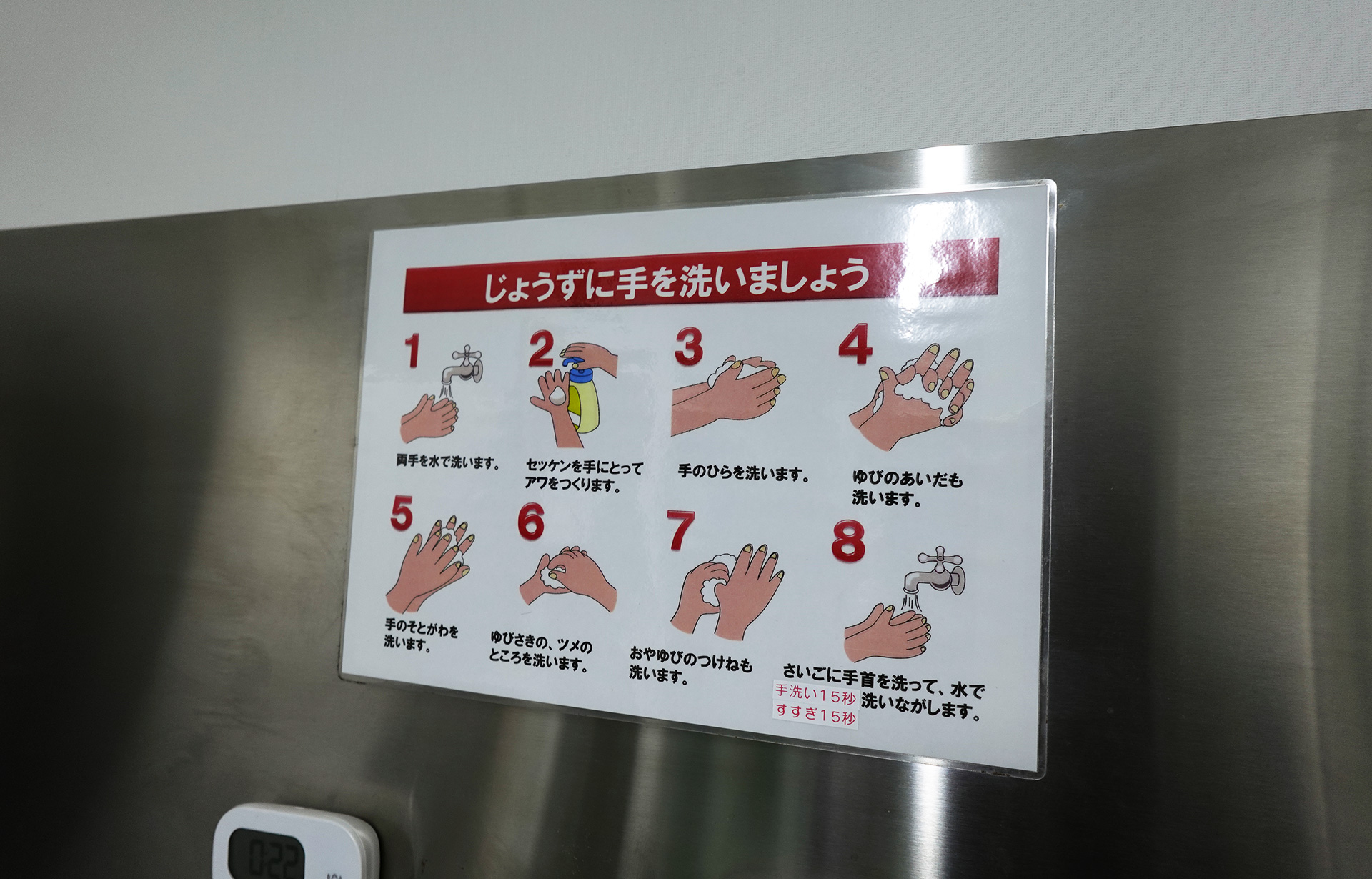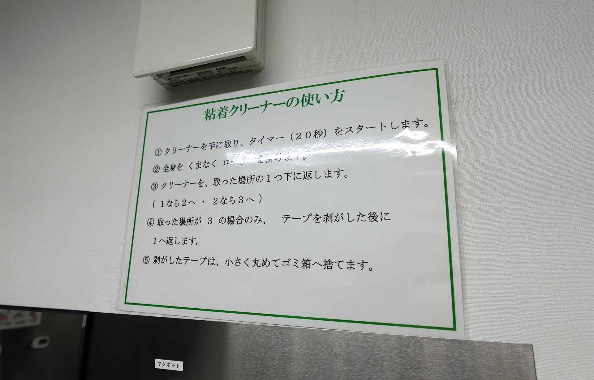 安心・安全なお米をお届けするために、衛生管理を徹底しています。エアシャワーや手洗い、粘着クリーナーの使用まで、すべてをマニュアル化し、日々の作業に確実に反映しています。